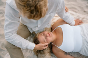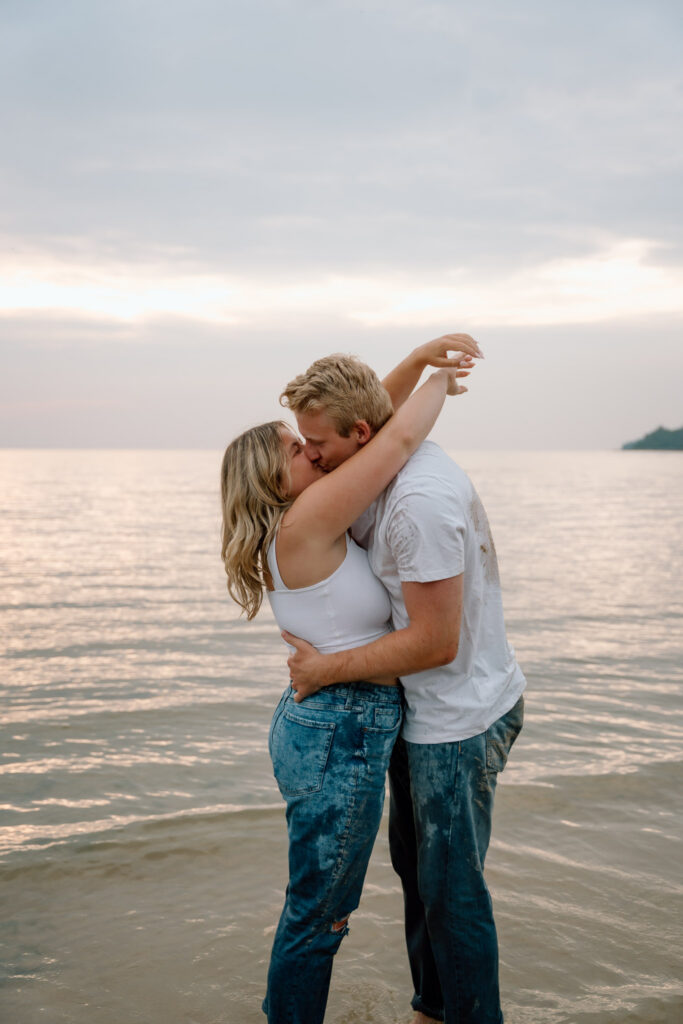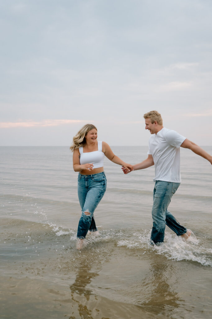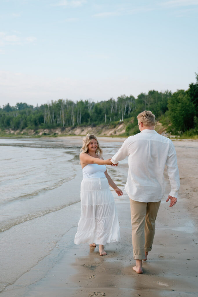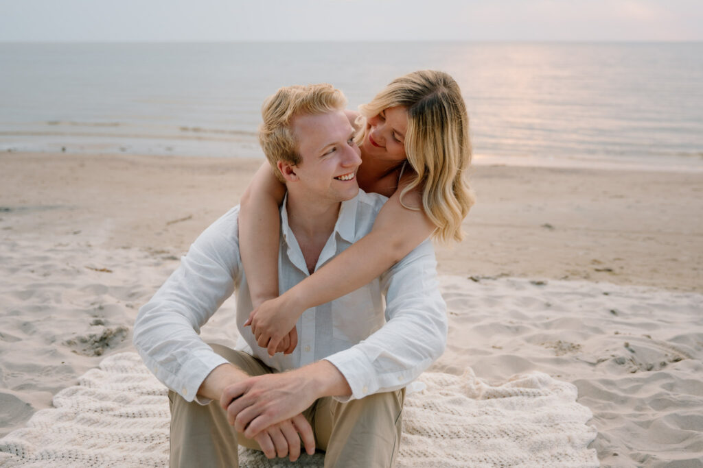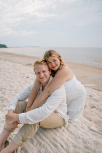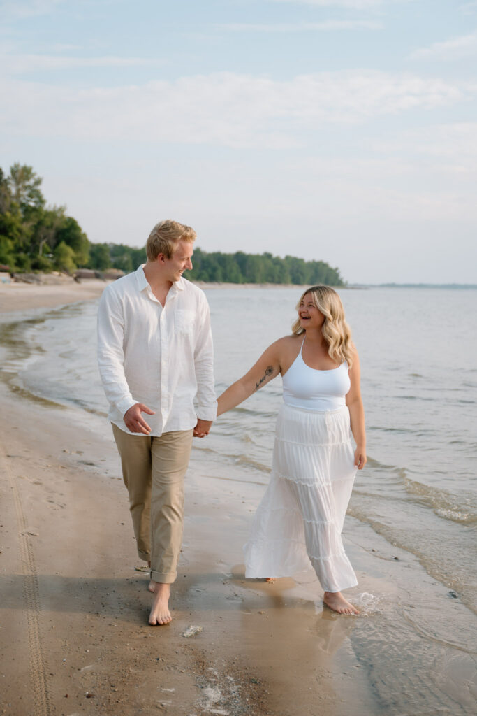 Instead of stiff posing, we focused on letting them walk the shoreline, laugh together, and just be themselves. The wind coming off the water, the quiet stretch of beach, and their natural connection made the whole evening feel effortless.